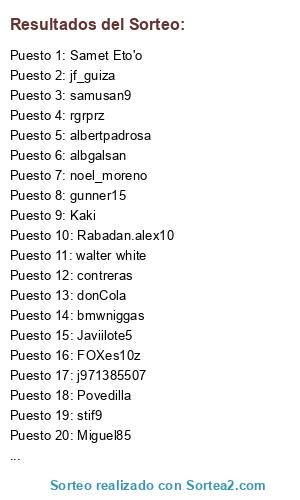 Lista de participantes: Ivairu, albertpadrosa, albgalsan, alexpitarque, beko_vic, gunner15, bmwniggas, carlosnavalon, FOXes10z, Spartacus2393, meness, j971385507, contreras, Lacalle90, Kaki, Kevinerik3, manolonti89, MM97, donCola, bol_bol5, Pachet, Samet Eto'o, Samugalego, samusan9, skinnyS, stif9, Yera980, Leobarcelona, Santyso, Vic_mister, walter white, jf_guiza, Miguel85, rgrprz, Sefis_10, Javiilote5, juankyraba, Rabadan.alex10, noel_moreno, Povedilla.