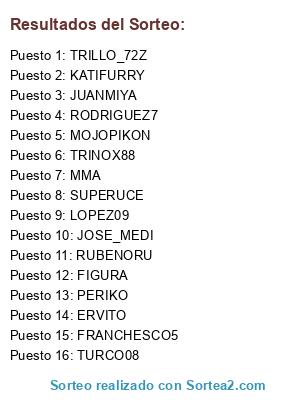 Lista de participantes: ERVITO, PERIKO, TURCO08, TRINOX88, LOPEZ09, RUBENORU, TRILLO_72Z, FRANCHESCO5, SUPERUCE, KATIFURRY, JOSE_MEDI, JUANMIYA, FIGURA, MMA, RODRIGUEZ7, MOJOPIKON.