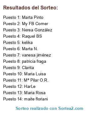 Lista de participantes: maite floriani, Raquel BS(3 participaciones), HarLe, kelika(3 participaciones), Maria Luisa(3 participaciones), Nerea González(2 participaciones), My FB Corner(3 participaciones), Marta Pinto(3 participaciones), Marta N.(3 participaciones), patricia fraga, Clarita, Maria Rosa, Mª Pilar O.R., vanesa jiménez.