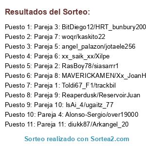 Lista de participantes: Pareja 1: Toldi67_F1/trackbil, Pareja 2: RasBoy78/siasarrr1, Pareja 3: BitDiego12/HRT_bunbury2008, Pareja 4: Alonso-Sergio/over19000, Pareja 5: angel_palazon/jotaele256, Pareja 6: xx_saik_xx/Xilpe, Pareja 7: woqr/kaskito22, Pareja 8: MAVERICKAMEN/Xx_JoanHD_xX, Pareja 9: Reaperdusk/ReservoirJuan, Pareja 10: IsAi_4/ugaitz_77, Pareja 11: diukk87/Arkangel_20.