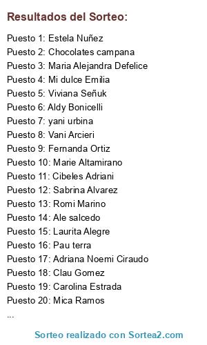 Lista de participantes: Sofii leiva, yani urbina, Adriana Noemi Ciraudo, Tamara Diaz, Gaby Tello, Marie Altamirano, Alis Demoña Salcedo, Laurita Alegre, Carla Sanchez, Roxana Sosa, Giuli Soto, Romix Sosa, Mis chimuelos, Andrea Veronica Altamirano, Guada Castaño, Gy Barreto, Pau terra, Ale salcedo, Romi Marino, Ani Peralta, Julieta videla, Gaby Sala, Tatiana Ramallo, Betty Vega, Cibeles Adriani, Maria Alejandra Defelice, Yessy Phatouros, Dai Patarini, Sonia Salas, Sabrina Coletta, Milena Antonieta, Sabrina Alvarez, Marce Martinez, Marianela Miccuchi, Pepper potts, Veronica Sichetti, Tamara Testoni, Juli Fernandez, Lei Agus Leiva, Laura Olmos, Nancy Bibiana Campodonico, Carolina Estrada, Silvana Franco, salo mozzi, Estela Nuñez, Sandra campodonico, Carolina Glimalt, Gaby Gauto, Juli Bianchi, Viviana Señuk, Fernanda Ortiz, Mary ibañez, Juli Crespo, Clau Gomez, Gabriela Storni, Vanesa Gomez, Micaela Defler, Romina Arcieri, Magali Agostina Arcieri, Karina Defler, Mica Ramos, Nidia Pascualini, Vani Arcieri, Viviana celesta camargo, Mi dulce Emilia, May Casco, Aldy Bonicelli, Car Albornoz, wandi Coronel, Paula Bustos, Silvana Saulino, Chocolates campana, Alejo Bargas, Ana carolina.