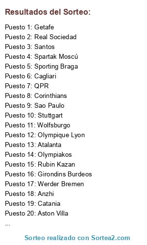 Lista de participantes: Wolfsburgo, Stuttgart, PSV Eindhoven, Sporting Braga, Hamburgo, Werder Bremen, Olympique Lyon, QPR, A.Mineiro, Sao Paulo, Spartak Moscú, Lille OSC, Corinthians, Getafe, Girondins Burdeos, Real Sociedad, Santos, Aston Villa, Udinese, Everton, Gremio, Atalanta, Ajax Amsterdam, Cagliari, Catania, B.Mönchengladbach, Olympiakos, Rubin Kazan, Anzhi, Olympique Marsella, Athletic Bilbao, Real Betis.