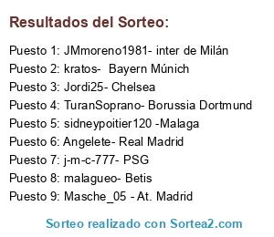 Lista de participantes: malagueo- Betis, j-m-c-777- PSG, Angelete- Real Madrid, kratos- Bayern Múnich, sidneypoitier120 -Malaga, JMmoreno1981- inter de Milán, Jordi25- Chelsea, TuranSoprano- Borussia Dortmund, Masche_05 - At. Madrid.