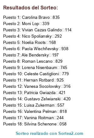 Lista de participantes: Daniela Lachster 752, Edith Oxilia 594, Sara Weinberger 426, Paola Sil Aisicoff 499, Olga Analia Gutierrez 541, Vero Thaler 859, Betty Javkin 632, Lilly Alpert 840, Cori Goldschmidt 534, Alejandra J. Angel 707, Nelson Domingo Martinez 808, Adriana Isabel Stegman 861, Veronica Brom 045, Luciana Calabrese 632, Bettina Muscillo 130, Marcelo Cesar Zelcer 286, Liliana Pajaro 367, Graciela Polonsky 247, Nora Patricia Cohen 045, Claudia Raichman 930, Jesica Dresner Fuchs 768, Silvi Dresner Fuchs 756, Pato Suarez 375, Flor Villarpando 026, Teresita Gelburt 208, Lilian Beatriz 888, Adela Dubinski 380, Noemi Marta Alvarez Beltran 969, Daniel Saig Hambra 614, Andrés Tineo Serrano 111, Leila Mayer 432, Jen Neu 965, Claudia Mabel Fatelevich 906, Carla Liberman 732, Fabiana Peña 791, Maria Rosa Feldman 266, Vanesa Socolovsky 316, Gabriela Urriaga 061, Andrea Dalamón 543, Shirley Szteinhendler 860, Patricia Peker 138, Liliana Minteguiaga 135, Jonathan Fleischman 343, Silvia Meresman 086, Diana Blostein 722, Susan Bene 502, Adriana Guzmán 585, Anabel Tellechea 144, Mery Anchorena 542, Ivan Dario Javkin 282, Liliana Herrera 511, Carolina Pelaggio 092, Gabriela Clemente 197, Vanesa Szwarcberg 912, Giuse Román 287, Lydia Mrejen 377, Sara Cuqui Vetcher 285, Marta Susana Kaplan 416, Anita Vásquez Pereda 463, Constanza Furman 283, Michelle Bursztyn 146, Lau Kalma 183, Perla Bruder 361, Ariel Popper 550, Vanesa Mayer 369, Jacqui Feiguelblat 082, Nadia Wengier 494, Melisa Trodler 474, Ana Estelles 479, Marta Largeau 535, Sheila Bembenaste 176, Ruth Koloditzky 606, Dorita Sapo 578, Ester Perez 642, Angela Arcuri 564, Viviana Hoizman 736, Sabrina Rabotnicoff 401, Débora Dalila 876, Rosana Annunziata 265, Sandra Donin 277, Rosita Schlimovich 496, Lorena Dickman 563, Valentina Pelman 818, Mariela Arslanian 287, Mercedes de la Paz 345, Maria Borges 699, Teresa Varone 780, Estela Sidelsky 210, Laura SolarMansilla 539, Sandra Torres 406, Patricia Pugliese 039, Mirta Bengoa 515, Vicky Hayon 086, Marcela Grinberg 713, Marta Schulman 159, Liliana Inés Fridman 257, Graciela Vert 270, Lina Kolsky 112, Sandra Krawiec 507, Romina Natalia Soto 231, Eni Herrmann 650, Jose Gabriel Rechusky 830, Gaby R Cajal 666, Vanesa Andrea Blady Frydman 741, María Rocío Rodríguez 614, Silvina Julia Szturm 912, Ines Elisa 255, Adriana Myriam Sznycer 575, Romina Safdie 052, Norma Diana Groisman 566, Silvia Fontanellaz 255, Melisa Umansky 791, Lilian Azzati 482, Lucia Elisa Degregorio 067, Julio Cesar Bringas 817, Guillermo Schapira 304, Eduardo Schwindt 326, Lucía Arrestía 805, Perla Scheindelman Lavy 293, Mabel Nancy Lopez 254, Rosa Begas 306, Fanny Podcaminsky 561, Eva Grosser Lerner 892, Gaya Diam 029, Deby Vaintroib 291, Vanina Roitman 244, Dani Galante 141, Silvia Kiel 399, Monica Blaer 393, Noemí Waks 704, Ariela Lejderman 861, Fabbri Maria Alejandra 424, Roxana Estela Dobrin 958, Miguel Jose Furman 361, Patricia Dawidzon 240, Nora Kaufman 291, Natalia Larsen 795, Nadina Kararon 246, Salomé Díaz 085, Alicia Kukawka 310, Clarita Malbin 619, Claudia Snaidman 654, Diana Noemi 604, Paula Lew 404, Leon Roumachkovsky 908, Carolina Salazar 370, Fabiana Borovich 951, Maria Eugenia Bardi 160, Ruthy Soibelman 777, Soli Trenyan 955, Victor Mekler 307, Carina Pacheco 214, Irma Rosen 408, Verònica Gabriela Contreras 179, Silvana Azar 122, Mabel Zele 624, Martin Desse 455, Diana Sverdlick 243, Javier Valdez 250, Mariano Figueroa 951, Celeste Castiglioni 779, Sergio Leonardo Lipchak 812, Elisa Dayan 612, Perla Rubinstein 984, Roxana Schapira 741, Mirtha Couselo 223, Diana Nudelman 353, Barbara Hold 146, Myriam Manzur 962, Ange Violeta Szu 541, Jaquelin Dunaiewsky 909, Viviana Lorenzo 096, Eva Wolyniec 031, Graciela Nejamkis 138, Graciela Edelman de Kahan 831, Diana Senderovsky 575, Saharaim Perez 773, Beatriz Hakim 960, Adriana Messing 299, Martha Beserman 662, Susana Costi 488, Graciela Lubel 306, Stella Maris 529, Marysol Sapoznik 459, Ana Herscovich 280, Mirta Gribeluk 950, Judith Ro 613, Martha Patricia Arango Delgado 391, Flora Leonor Schvartzman 454, Yae Galant 034, Mirta Jadzinsky 544, Paula Barbarich 878, Diana Gilis 325, Betty Kronenberg 131, Stephanie Guitman 313, Estela Sztokhamer 755, Laura Rubinstein 868, Lidia Wainerman 316, Jorge Waisman 945, Irene Crenovich 256, Adriana Lifschitz 461, Silvina Goldman 181, Gabriela Bunbury 388, Domingo Enrique Barbatelli 979, Galia Kohon 330, Luis Gonzalez 364, Nico Spoliansky 292, Marcela Schnaider 707, Ruth Ross 967, Rosana Adami Leleu 265, Sandra Cafarelli 465, Virginia da Ressurreicao 733, Hilda Zully 988, Miriam Biderman 088, Fatima Largeau 880, Miguel Angel Jose Trotta 812, Lucy Amato 428, Gabriel Polensvaig 497, Iris Serrano 641, Dafu Hofman 440, Abel Barabas 857, Betty Aimar 845, Mica Landau 344, Betina Paola Colavecchia 224, Graciela Estray 631, Jacqueline Gruber 535, Moni Lop 339, Elizabeth Keitelman 802, Natalia Balaban 055, Silvina Schenone 058, Elena SchdeAl 289, Mirta Julia Gilman 135, Daniel Litman 466, Shirly Procianoy 260, Tammy Steimetz 983, Magali Schvarzman 436, Marta S. Ventura 482, Tami Zibes 525, Noelia Giterman 463, Rosana Silberman 106, Damian Rabinovich 568, Susana Alegria 536, Liat Zylber 589, Silvia Kalniker 593, Magali Gura 668, Liliana Esersky 685, Adriana Meresman 430, Brian Fraiman 166, Graciela Lindner 892, Liliana Campanela 602, Eliana Ilionski 409, Marta Rut Mayo 867, Ana Graciela Piazza 823, Esther Roth 389, Norma Diaz 714, Clara Lederfarb 790, Fabiana Hakim 272, Angie Bernard 461, Raquel Uri 595, Laura Kremer 660, Maru Aboud 899, Ingrid Hamburg 285, Mabel Raik 185, Adriana García 384, Edith Sigal 669, Javier Barqui 617, Margarita Sasson 872, Karina Goldstein 818, Marcelo D. Krumecadyk 617, Florencia Szarfsztein 122, Kuky Margulies Lichtman 545, Graciela Noemi Miranda 007, Sara Stern 244, Max Szuchman 617, Noelia Roots 168, Jorge Hugo Ianco 020, Carolina Benchuya 932, Marcela Ruya 970, Susana Denker 879, Miriam Gobbi 761, Daia 