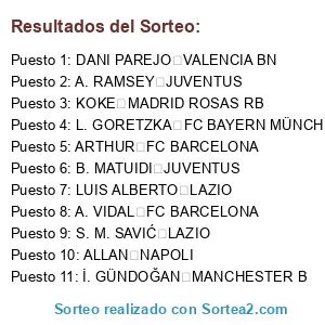 Lista de participantes: A. VIDAL FC BARCELONA, S. M. SAVIĆ LAZIO, KOKE MADRID ROSAS RB, DANI PAREJO VALENCIA BN, A. RAMSEY JUVENTUS, ARTHUR FC BARCELONA, B. MATUIDI JUVENTUS, L. GORETZKA FC BAYERN MÜNCHEN, İ. GÜNDOĞAN MANCHESTER B, ALLAN NAPOLI, LUIS ALBERTO LAZIO.