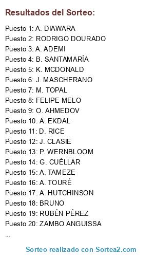 Lista de participantes: RUBÉN PÉREZ, MIKEL MERINO, FERNANDO, L. DENDONCKER, O. AHMEDOV, M. SCHNEIDERLIN, SAN JOSÉ, M. TEKDEMIR, D. LE TALLEC, T. KOOPMEINERS, G. CUÉLLAR, M. TOPAL, RODRIGO DOURADO, FELIPE MELO, A. ADEMI, A. EKDAL, M. ARAMBARRI, A. TOURÉ, K. MCDONALD, A. ROMAO, T. SOUČEK, A. TAMEZE, O. YOKUŞLU, B. SANTAMARÍA, I. DAMONTE, P. WERNBLOOM, T. RINCÓN, OMAR MASCARELL, D. RICE, E. CAPOUE, J. CORK, BRUNO, A. HUTCHINSON, P. LASNE, ZAMBO ANGUISSA, J. CLASIE, J. MASCHERANO, A. DIAWARA, BAUMGARTLINGER.