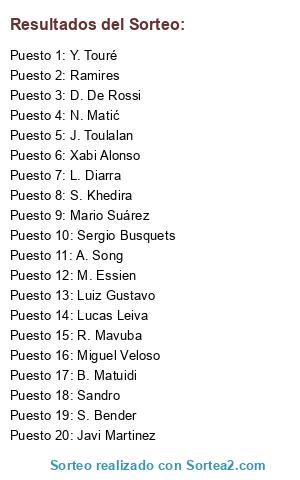 Lista de participantes: Y. Touré, Sergio Busquets, Xabi Alonso, S. Khedira, Javi Martinez, D. De Rossi, A. Song, J. Toulalan, Sandro, Luiz Gustavo, S. Bender, Lucas Leiva, B. Matuidi, R. Mavuba, M. Essien, N. Matić, Ramires, Miguel Veloso, Mario Suárez, L. Diarra.