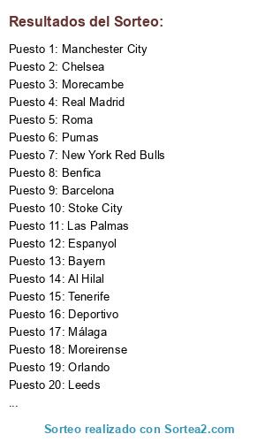 Lista de participantes: Barcelona, Tenerife, Al Hilal, Real Madrid, Stoke City, Roma, Granada, Orlando, Espanyol, Colo Colo, Morecambe, Pumas, Bayern, Chelsea, Deportivo, Manchester City, Las Palmas, Liverpool, Moreirense, Málaga, New York Red Bulls, Benfica, Leeds, Anderletch.