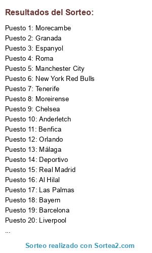 Lista de participantes: Barcelona, Tenerife, Al Hilal, Real Madrid, Stoke City, Roma, Granada, Orlando, Espanyol, Colo Colo, Morecambe, Pumas, Bayern, Chelsea, Deportivo, Manchester City, Las Palmas, Liverpool, Moreirense, Málaga, New York Red Bulls, Benfica, Leeds, Anderletch.