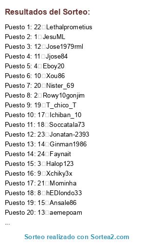 Lista de participantes: 1 JesuML, 2 Rowy10gonjim, 3 Halop123, 4 Eboy20, 5 Varela2210, 6 FaJaRDoMaN, 7 fernan1981Con, 8 hEDlondo33, 9 Xchiky3x, 10 Xou86, 11 Jjose84, 12 Jose1979rml, 13 aemepoam, 14 Ginman1986, 15 Ansale86, 16 Anyelote1985-, 17 Ichiban_10, 18 Soccatala73, 19 T_chico_T, 20 Nister_69, 21 Mominha, 22 Lethalprometius, 23 Jonatan-2393, 24 Faynait.