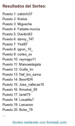 Lista de participantes: Ianel79, Kratos, Jose_vallecas19, Yiral87, Jorgitoceuta, Guille_lm, Lexusxxv, Kimatrai_69, Manuwatagata, cortex_xx, Bubo_79, BwsHDR, Tu_du3nd3_, danny_747, Fabiete-murcia, GarryPes, Losadita7, Naf_lon_sama, zatoichi37, Davilon82, Migueche, reymago11, ippon_10_.