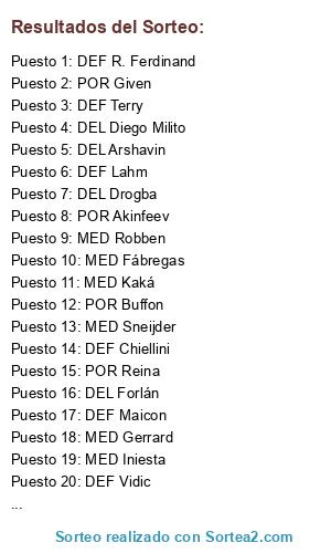 Lista de participantes: POR Julio Cesar, POR Buffon, POR Valdés, POR Reina, POR Akinfeev, POR Adler, POR Lloris, POR Given, POR Cech, DEF Vidic, DEF Lucio, DEF Maicon, DEF Lahm, DEF Terry, DEF Dani Alves, DEF Chiellini, DEF R. Ferdinand, MED Iniesta, MED Xavi, MED Robben, MED Lampard, MED Kaká, MED Sneijder, MED Ribéry, MED Gerrard, MED Fábregas, MED Xabi Alonso, DEL Villa, DEL Rooney, DEL Drogba, DEL Forlán, DEL Diego Milito, DEL Tévez, DEL Fernando Torres, DEL Arshavin.