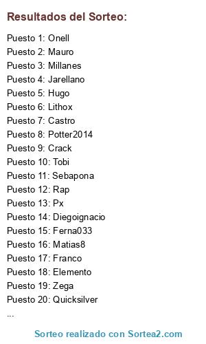 Lista de participantes: Px, Kez0n, Elemento, Llerar, Diegoignacio, Matias8, Rap, Onell, Sebapona, Ferna033, Millanes, Darkoxz, Hugo, Quicksilver, Crack, Zega, Lithox, Franco, Jarellano, Mauro, Castro, Potter2014, Tobi, Luxo.