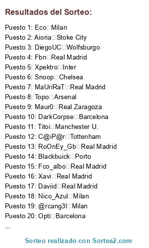 Lista de participantes: Nacho Fiorentina, Blackbuick Porto, Fx Chelsea, Opti Barcelona, Dreyko Chelsea, C@iP@r Tottenham, Xpektro Inter, Ibisevic19 Chelsea, JL Chelsea, Scofield Real Madrid, Darkoxz PSG, DiegoUC Wolfsburgo, Jona Inter, RoOnEy_Gb Real Madrid, Xavi Real Madrid, Eco Milan, Kezon Real Madrid, Kendo Manchester City, -AxO- Manchester U., Fbn Real Madrid, Daviid Real Madrid, Maur0 Real Zaragoza, Camilo! Real Madrid, DarkCorpse Barcelona, Topo Arsenal, Snoop Chelsea, Fco_albo Real Madrid, Sebas Milan, PoC-hugo Liverpool, ockeside Manchester U., XunXoOThebesT Barcelona, Aioria Stoke City, mariov16 Real Madrid, MaUriRaT Real Madrid, CrozZ Real Madrid, Alvarilloh Barcelona, Negro_T__T Chelsea, socram Real Madrid, Steeban, Nico_Azul Milan, SkYLiNe Manchester U., Tutto Chelsea, Titoi Manchester U., jaymz, Adrian Milan, Tatann Real Madrid, Monipo Arsenal, @rcang3l Milan.