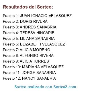 Lista de participantes: NANCY SANABRIA, ALICIA MORENO, JUAN IGNACIO VELASQUEZ, CESAR SANABRIA, ALICIA TORRES, ANDRES SANABRIA, ELIZABETH VELASQUEZ, ALFONSO RIVERA, JUAN FELIPE GALINDO, MARIANA VELASQUEZ, DORIS RIVERA, LILIANA SANABRIA, JORGE SANABRIA, TERESA HINCAPIE.