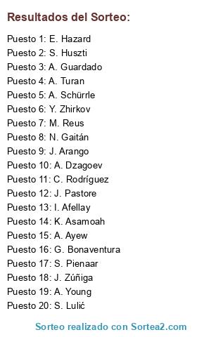 Lista de participantes: M. Reus, E. Hazard, A. Turan, N. Gaitán, A. Guardado, A. Schürrle, A. Ayew, C. Rodríguez, A. Young, S. Pienaar, J. Pastore, G. Bonaventura, S. Lulić, A. Dzagoev, K. Asamoah, J. Zúñiga, I. Afellay, Y. Zhirkov, S. Huszti, J. Arango.