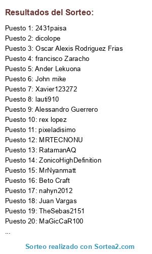 Lista de participantes: sporecool98, AnderSCfull, yoyyo888, PpAaCcHhUuKkIiNn, Juan Vargas, 94Domene, Steven Z, Kimiwa Mio, Narux Vicius, Sandro De jesus, Ander Lekuona, Javier MGamer, Javicroket, ThePIKGames(2 participaciones), ynujose, Andres Estrada(2 participaciones), pixeladisimo, D34DMinecraft, rex lopez, billy garcia cheves, MrJapemo, syn7SeveN, dicolope, MaGicCaR100, Pepe Estrada, 2431paisa, jhonsitoarias112, alexstuto13, superdeco183, Miguel Cabrera, TheMrAitor, Matias Ramirez, ErOma7, geronimo green, Isaac Moreno Suárez, jose Hernandez, Jorge Cotera, Xavier123272(2 participaciones), francisco Zaracho, darken mc, AlejandroToLoko100, Beto Craft, MrNyanmatt, Dante7970, victor moya, tio la vara, alex brayan alcantara leon, MrSonnyMNC, manuel menendez valledor, AddonsGAQC, Alessandro Guerrero, Ivan Ariel, Keco Jones, AdriColombo1996, MegaIVANILLO, MINEKadabraBr, juniorwatch67, TheVento666, raymundo sabido gallegos, RatamanAQ, jorgecitor, TheKogurio, AlmuGames, Peques321, Thabatta Vasquez, diego gomez, hectorhaic23, John mike(10 participaciones), iAskoh, HeVistoFocas, Thepickpocketafull, bentenkai, Bill Garmendia, Matewitto, TheFamiliGamers, nahyn2012, Oscar Alexis Rodriguez Frias(10 participaciones), TheSebas2151, MRTECNONU, XeNz489, Matew Pandelo, Junior Hudson, lauti910, REnoxD1, ZonicoHighDefinition, jayson norabuena.