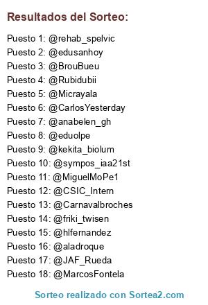 Lista de participantes: @aladroque, @ImaLegarda, @MarcosFontela, @Micrayala, @MiguelMoPe1, @joseramosvivas, @serge_fm, @eduolpe, @AnaYeste_, @DrRaulDM, @Rubidubii, @anabelen_gh, @friki_twisen, @rehab_spelvic, @TuSocialMedia, @pihercios, @CarlosYesterday, @Manuelglesihas, @CristinaDanish, @kekita_biolum, @Carnavalbroches, @hlfernandez, @vitolsalme, @CSIC_Intern, @edusanhoy, @phytotuit, @Jfdzz, @biotropicalMS, @sympos_iaa21st, @Yoko_oEiluj, @BrouBueu, @Peivol_22, @ardillitachiki, @JAF_Rueda.
