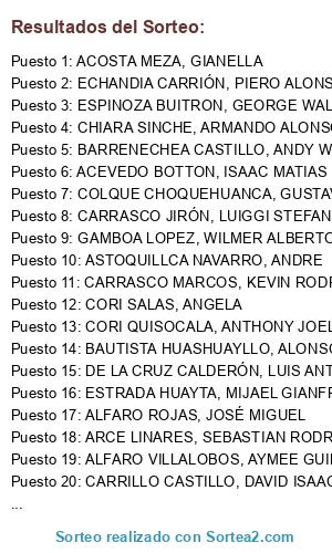 Lista de participantes: ACEVEDO BOTTON, ISAAC MATIAS, ACOSTA MEZA, GIANELLA, ALFARO ROJAS, JOSÉ MIGUEL, ALFARO VILLALOBOS, AYMEE GUILIANA, ARCE LINARES, SEBASTIAN RODRIGO, ARGUEDAS GARAY, ADRIAN MARTIN, ASTOQUILLCA NAVARRO, ANDRE, BARRENECHEA CASTILLO, ANDY WILLIAMS, BAUTISTA HUASHUAYLLO, ALONSO, BAZAN DOMINGUEZ, PAUL ALEXANDER, BELEN CONTRERAS, RENZO RAFAEL, CAMACHO PESCORAN, PATRICIA GERALDINE, CARHUAMACA RIVERA, STEFANY MILUSKA, CARRASCO JIRÓN, LUIGGI STEFANO, CARRASCO MARCOS, KEVIN RODRIGO, CARRILLO CASTILLO, DAVID ISAAC, CHAIÑA SALAZAR, CARLOS ALBERTO, CHIARA SINCHE, ARMANDO ALONSO, COLQUE CHOQUEHUANCA, GUSTAVO, CORI QUISOCALA, ANTHONY JOEL, CORI SALAS, ANGELA, CRUZADO GUTIERREZ, ALESSANDRO DEL PIERO, CUETO COCHACHIN, FRANSHESCO DEL PIERO, DE LA CRUZ CALDERÓN, LUIS ANTONIO, DE LA CRUZ ORTIZ, DIEGO DANIEL, DOZA GAMONAL, DEBBY XIMENA, ECHANDIA CARRIÓN, PIERO ALONSO, ESPINOZA BUITRON, GEORGE WALTER, ESTRADA HUAYTA, MIJAEL GIANFRANCO, GAMBOA LOPEZ, WILMER ALBERTO, GARCIA TAIPE, JOSE MIGUEL ALEJANDRO.
