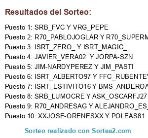 Lista de participantes: ISRT_ZERO_ Y ISRT_MAGIC_, ISRT_ALBERTO97 Y FFC_RUBENTEVE, R70_PABLOJOGLAR Y R70_SUPERMARIO, JAVIER_VERA02 Y JORPA-SZN, ISRT_ESTIVITO16 Y BMS_ANDEROA_245, XXJOSE-ORENESXX Y POLEAS81, R70_ANDRESAG Y ALEJANDRO_ES_02, JIM-NARDYPEREZ Y JIM_PASTI, SRB_LUMOCRE Y ASK_OSCARFJ27, SRB_FVC Y VRG_PEPE.