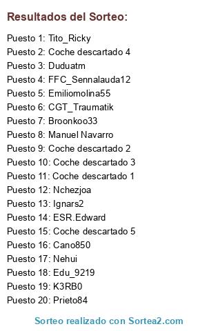 Lista de participantes: CGT_Traumatik, Edu_9219, Manuel Navarro, Nchezjoa, Tito_Ricky, Emiliomolina55, Cano850, Duduatm, Nehui, Ignars2, ESR.Edward, Broonkoo33, K3RB0, FFC_Sennalauda12, Prieto84, Coche descartado 1, Coche descartado 2, Coche descartado 3, Coche descartado 4, Coche descartado 5.
