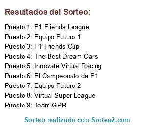 Lista de participantes: Virtual Super League, Team GPR, F1 Friends League, The Best Dream Cars, Innovate Virtual Racing, F1 Friends Cup, El Campeonato de F1, Equipo Futuro 1, Equipo Futuro 2.