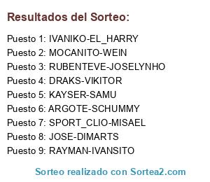 Lista de participantes: KAYSER-SAMU, RAYMAN-IVANSITO, ARGOTE-SCHUMMY, DRAKS-VIKITOR, RUBENTEVE-JOSELYNHO, SPORT_CLIO-MISAEL, JOSE-DIMARTS, MOCANITO-WEIN, IVANIKO-EL_HARRY.