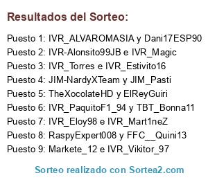 Lista de participantes: IVR-Alonsito99JB e IVR_Magic, RaspyExpert008 y FFC__Quini13, IVR_ALVAROMASIA y Dani17ESP90, IVR_PaquitoF1_94 y TBT_Bonna11, Markete_12 e IVR_Vikitor_97, JIM-NardyXTeam y JIM_Pasti, TheXocolateHD y ElReyGuiri, IVR_Torres e IVR_Estivito16, IVR_Eloy98 e IVR_Mart1neZ.