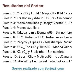 Lista de participantes: FFC_Thekik2 y Tikilo69 - Maño&Valenciano F1 Team, FFC_Robert y FFC_Rubenteve - Levante Friends Team, Sport_Clio y Matiyes95 - IslasCanariasF1Team, Manolomakinas y RaspyExpert008 - Tortucoles F1 Team, Peryco y Elpelijas - Adestiempo Racing Team, Aleix44 y Fer_vivaelmadrid - Avanti F1 Team, Quini13 y FTT-F1Magic-ftt - K1-F1-Team, Frzalonso y Adolfo_98_Rs - Sin nombre, Takoda_Jim y Bernalte88 - Sin nombre, K3rb0_ y Braiisinho - Sin nombre, Monoplaza libre.