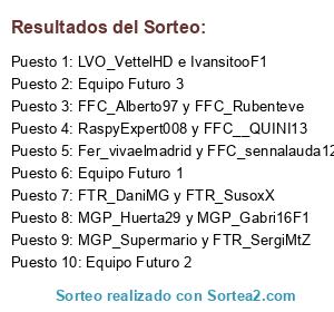 Lista de participantes: FFC_Alberto97 y FFC_Rubenteve, FTR_DaniMG y FTR_SusoxX, MGP_Huerta29 y MGP_Gabri16F1, RaspyExpert008 y FFC__QUINI13, Fer_vivaelmadrid y FFC_sennalauda12, MGP_Supermario y FTR_SergiMtZ, LVO_VettelHD e IvansitooF1, Equipo Futuro 1, Equipo Futuro 2, Equipo Futuro 3.