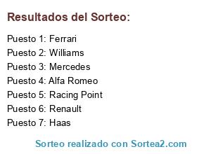 Lista de participantes: Mercedes, Ferrari, Red Bull, Racing Point, Mclaren, Renault, Alfa Romeo, AlphaTauri, Williams, Haas.