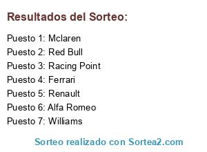 Lista de participantes: Mercedes, Ferrari, Red Bull, Racing Point, Mclaren, Renault, Alfa Romeo, AlphaTauri, Williams, Haas.