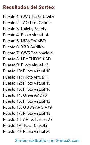 Lista de participantes: NICKOV XBD, RulettyPetrelly, LEYEND99 XBD, GUSGARCIA19, APEX Falcon 27, GreenAYO78, TCC Dankobi, CWR PaPaDeViLs, XBD SoNiKo, TAO LitosGetafe, CWRPaolomaldini, Piloto virtual 12, Piloto virtual 13, Piloto virtual 14, Piloto virtual 15, Piloto virtual 16, Piloto virtual 17, Piloto virtual 18, Piloto virtual 19, Piloto virtual 20.