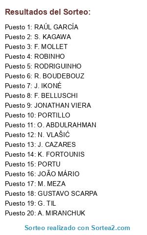 Lista de participantes: O. ABDULRAHMAN, JONATHAN VIERA, N. VLAŠIĆ, M. MEZA, PORTU, G. TIL, GUSTAVO SCARPA, F. MOLLET, F. BELLUSCHI, RODRIGUINHO, PORTILLO, S. KAGAWA, J. CAZARES, K. FORTOUNIS, R. BOUDEBOUZ, RAÚL GARCÍA, A. MIRANCHUK, ROBINHO, J. IKONÉ, JOÃO MÁRIO.