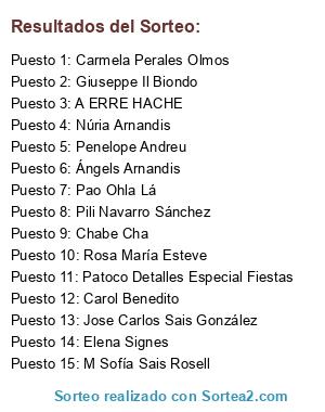 Lista de participantes: Pao Ohla Lá, A ERRE HACHE, Ángels Arnandis, Carol Benedito, Rosa María Esteve, Giuseppe Il Biondo, Carmela Perales Olmos, M Sofía Sais Rosell, Patoco Detalles Especial Fiestas, Pili Navarro Sánchez, Núria Arnandis, Elena Signes, Jose Carlos Sais González, Chabe Cha, Penelope Andreu, .