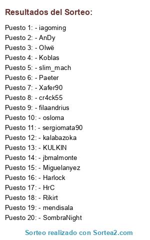 Lista de participantes: - Rikirt, - Koblas, - jbmalmonte, - cr4ck55, - iagoming, - AnDy, - KULKIN, - HrC, - filaandrius, - mendisala, - Harlock, - Olwë, - osloma, - sergiomata90, - Miguelanyez, - SombraNight, - slim_mach, - Xafer90, - Paeter, - kalabazoka.