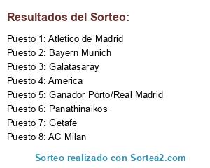 Lista de participantes: Atletico de Madrid, AC Milan, Bayern Munich, Panathinaikos, Getafe, Galatasaray, America, Ganador Porto/Real Madrid.