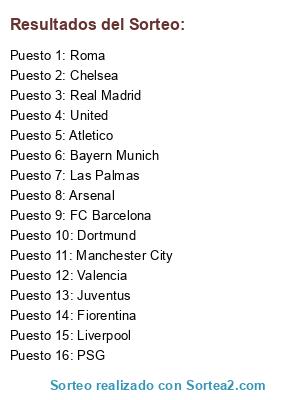Lista de participantes: Bayern Munich, Chelsea, Real Madrid, PSG, FC Barcelona, Juventus, Valencia, Manchester City, Roma, Liverpool, Dortmund, Fiorentina, Las Palmas, Atletico, United, Arsenal.