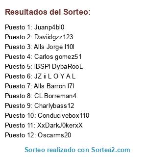 Lista de participantes: CL Borreman4, Daviidgzz123, Alls Jorge l10l, lBSPl DybaRooL, Alls Barron l7l, XxDarkJ0kerxX, Oscarms20, Juanp4bl0, JZ ii L O Y A L, Charlybass12, Conducivebox110, Carlos gomez51.