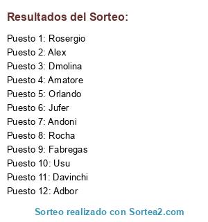Lista de participantes: Orlando, Amatore, Rocha, Andoni, Alex, Jufer, Davinchi, Dmolina, Rosergio, Usu, Adbor, Fabregas.