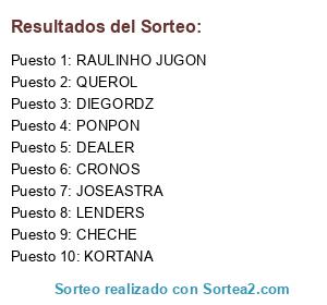 Lista de participantes: CRONOS, CHECHE, QUEROL, KORTANA, PONPON, DEALER, JOSEATRA, DIEGORDZ, LENDERS, RAULINHO JUGON, FRANXISCO, ITOGOL.
