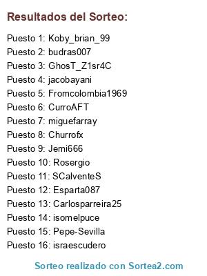 Lista de participantes: Esparta087, jacobayani, isomelpuce, SCalventeS, Jemi666, Koby_brian_99, Carlosparreira25, GhosT_Z1sr4C, Fromcolombia1969, miguefarray, Pepe-Sevilla, israescudero, Churrofx, Rosergio, CurroAFT, budras007.