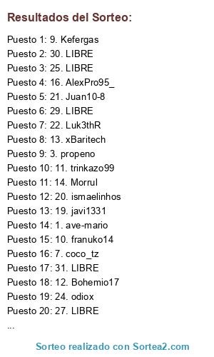 Lista de participantes: 1. ave-mario, 2. ChaNi_91, 3. propeno, 4. slq9, 5. MithosRla, 6. Triplakovic, 7. coco_tz, 8. sokitas69, 9. Kefergas, 10. franuko14, 11. trinkazo99, 12. Bohemio17, 13. xBaritech, 14. Morrul, 15. gijon18, 16. AlexPro95_, 17. Juanito_Xere11, 18. vicentinho83v2, 19. javi1331, 20. ismaelinhos, 21. Juan10-8, 22. Luk3thR, 23. xXFranCoDXx, 24. odiox, 25. LIBRE, 26. LIBRE, 27. LIBRE, 28. LIBRE, 29. LIBRE, 30. LIBRE, 31. LIBRE, 32. LIBRE.