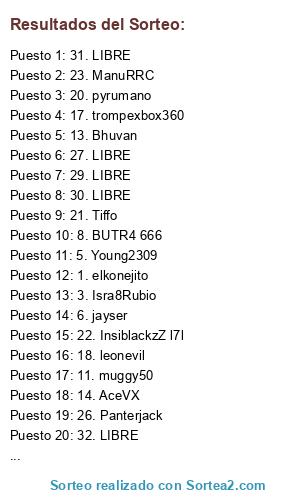 Lista de participantes: 1. elkonejito, 2. jjgalloso, 3. Isra8Rubio, 4. Biv0ck, 5. Young2309, 6. jayser, 7. KaMpE90, 8. BUTR4 666, 9. ronaldo59992, 10. huesin, 11. muggy50, 12. xXxMaZoRxXx, 13. Bhuvan, 14. AceVX, 15. TnTCaBeZaS, 16. GoriD13, 17. trompexbox360, 18. leonevil, 19. EVL MALAGUISTA4, 20. pyrumano, 21. Tiffo, 22. InsiblackzZ l7l, 23. ManuRRC, 24. x el pardela x, 25. Ansschutz, 26. Panterjack, 27. LIBRE, 28. LIBRE, 29. LIBRE, 30. LIBRE, 31. LIBRE, 32. LIBRE.