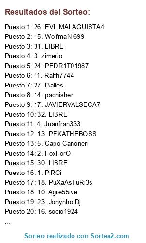 Lista de participantes: 1. PiRCi, 2. FoxForO, 3. zimerio, 4. Juanfran333, 5. Capo Canoneri, 6. Yakozi, 7. taxmanbcn, 8. elluisma89, 9. xGorKaZz, 10. Agre55ive, 11. Ralfh7744, 12. WiroWichii, 13. PEKATHEBOSS, 14. pacnisher, 15. WolfmaN 699, 16. socio1924, 17. JAVIERVALSECA7, 18. PuXaAsTuRi3s, 19. Davor Castro, 20. Veneivol, 21. dani9210, 22. pepepo94, 23. Jonynho Dj, 24. PEDR1T01987, 25. zimmer1993, 26. EVL MALAGUISTA4, 27. l3alles, 28. kanuto81, 29. LIBRE, 30. LIBRE, 31. LIBRE, 32. LIBRE.