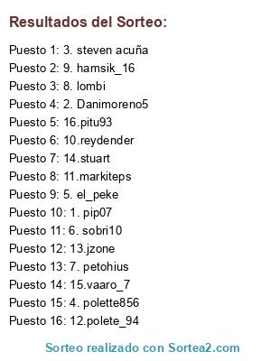 Lista de participantes: España: 3. steven acuña, Brasil: 9. hamsik_16, Holanda: 8. lombi, Alemania: 2. Danimoreno5, Portugal: 16.pitu93, Argentina: 10.reydender, Italia: 14.stuart, Bélgica: 11.markiteps, Uruguay: 5. el_peke, Rúsia: 1. pip07, Francia: 6. sobri10, Suecia: 13.jzone, Chile: 7. petohius, Inglaterra: 15.vaaro_7, México: 4. polette856, Costa de Marfil: 12.polete_94.