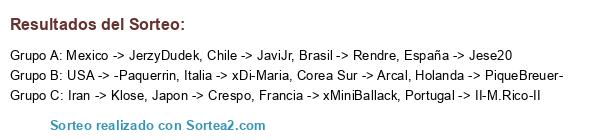Lista de participantes: España -> Jese20, Mexico -> JerzyDudek, Japon -> Crespo, Brasil -> Rendre, Francia -> xMiniBallack, Italia -> xDi-Maria, Corea Sur -> Arcal, Holanda -> PiqueBreuer-, Chile -> JaviJr, Portugal -> II-M.Rico-II, Iran -> Klose, USA -> -Paquerrin.