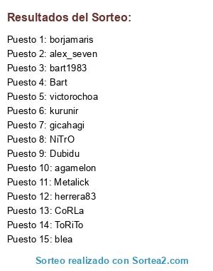 Lista de participantes: ToRiTo, bart1983, Metalick, borjamaris, blea, kurunir, gicahagi, victorochoa, Bart, NiTrO, CoRLa, alex_seven, agamelon, herrera83, Dubidu.