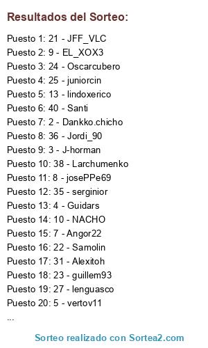 Lista de participantes: 1 - Abundi, 2 - Dankko.chicho, 3 - J-horman, 4 - Guidars, 5 - vertov11, 6 - javiii_11, 7 - Angor22, 8 - josePPe69, 9 - EL_XOX3, 10 - NACHO, 11 - Nevi, 12 - Mati, 13 - lindoxerico, 14 - Pol___, 15 - Nestor2809, 16 - Tirso4, 17 - Sete_Alfre, 18 - Pocho, 19 - antoninho10, 20 - Fullu, 21 - JFF_VLC, 22 - Samolin, 23 - guillem93, 24 - Oscarcubero, 25 - juniorcin, 26 - borjalfe, 27 - lenguasco, 28 - guayabito, 29 - diegotrival, 30 - billo, 31 - Alexitoh, 32 - txoman, 33 - blea, 34 - jordi_m92, 35 - serginior, 36 - Jordi_90, 37 - Jose84sev, 38 - Larchumenko, 39 - cheguevara, 40 - Santi.