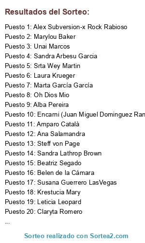 Lista de participantes: Sandra Arbesu Garcia, Kristin Morgendorffer, Alba Pereira, Beatriz Segado, Belen de la Cámara, Srta Wey Martin, Laura Lopez, Krestucia Mary, Marta García García, Oh Dios Mio, Priscilla Gaviño, Raquel Hernadi, Susana Guerrero LasVegas, Amparo Català, Ana Salamandra, Marylou Baker, Laura Krueger, Claryta Romero, Alex Subversion-x Rock Rabioso, Leticia Leopard, Steff von Page, Unai Marcos, Valle Suarez Burrero, Maria Palomo, Encarni (Juan Miguel Dominguez Rangel), Sandra Lathrop Brown.